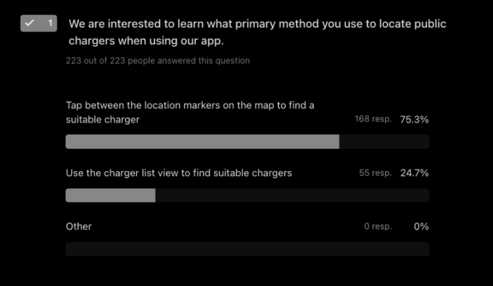 Users: Conducted a user survey presenting low-fidelity wireframes of this solution to active users of our app. Results showed that 81% of users felt this solution would significantly improve their experience in locating public chargers.