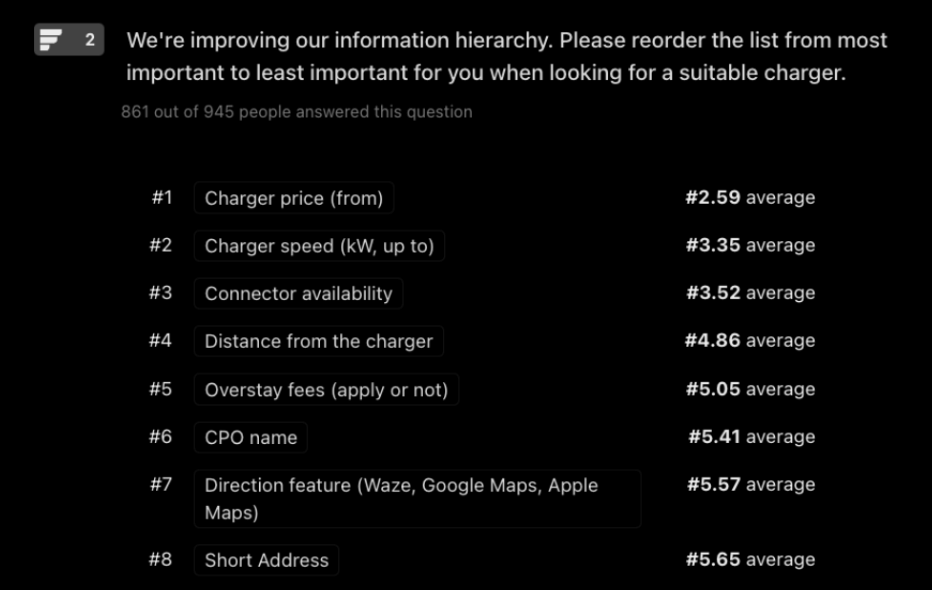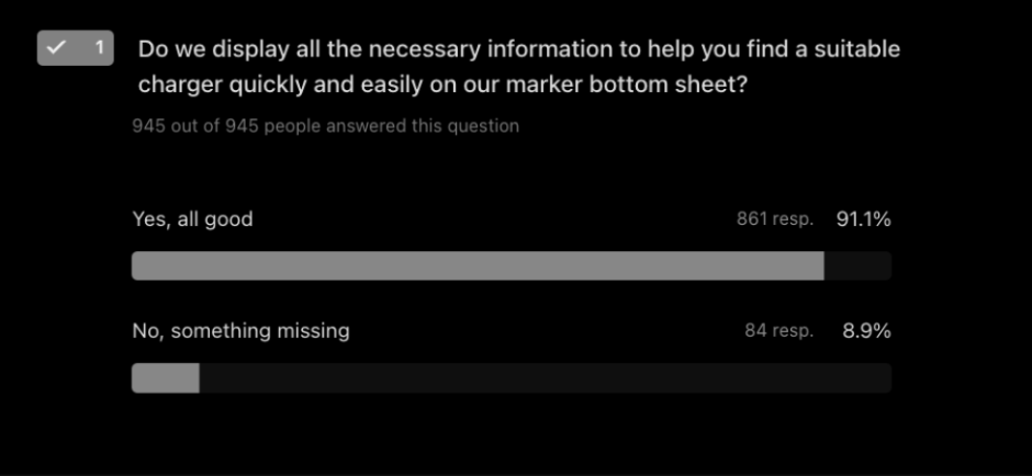 We aimed to understand our users' needs and requirements to enhance our existing map screen, marker bottom sheet, and FAB (Floating Action Button) usage. Our goal was to validate which information was most useful to our users when they were looking for a public charger and identify any information and features that were less valuable.